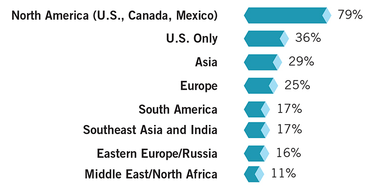 That’s not to suggest North American 3PLs are shrinking footprints. Quite the contrary. While the majority of shippers surveyed use 3PLs in North America (79 percent), Asia (29 percent), Europe (25 percent), and Southeast Asia/India (17 percent) are well represented (see Figure 7). 3PL global footprints align accordingly. Manufacturers and retailers are scanning the globe, looking for new markets to sell into and distribute through.