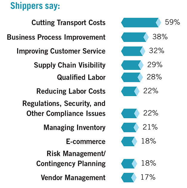 Shipper outsourcing priorities in 2017 remain similar to past years. Cutting transport costs is the top challenge, say 59 percent of respondents (see Figure 4). Business process improvement (38 percent), better customer service (32 percent), and supply chain visibility (29 percent) follow.